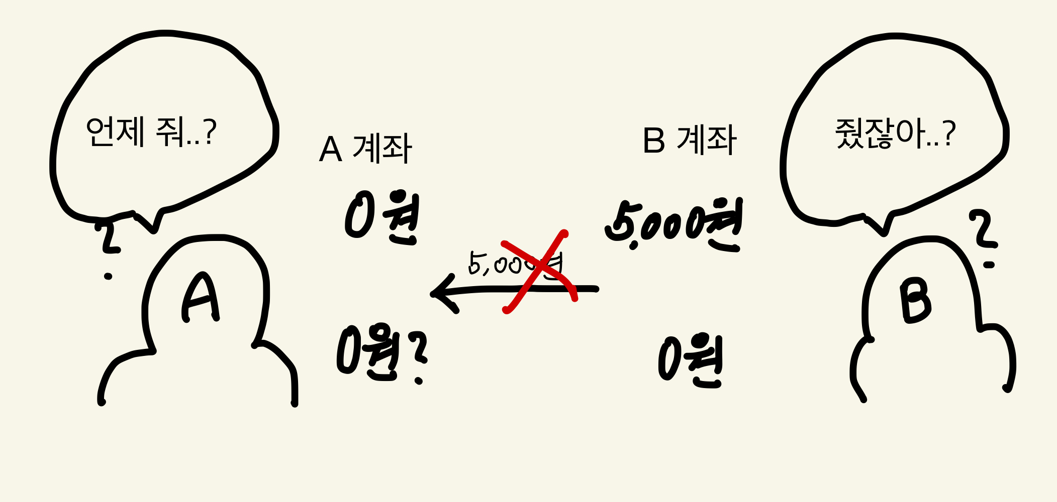분명 B 입장에서는 돈을 보내줬기 때문에 5,000원이 계좌에서 빠져나갔는데, A는 받지 못했다. 서로 오해가 쌓여 싸우기 직전이다.