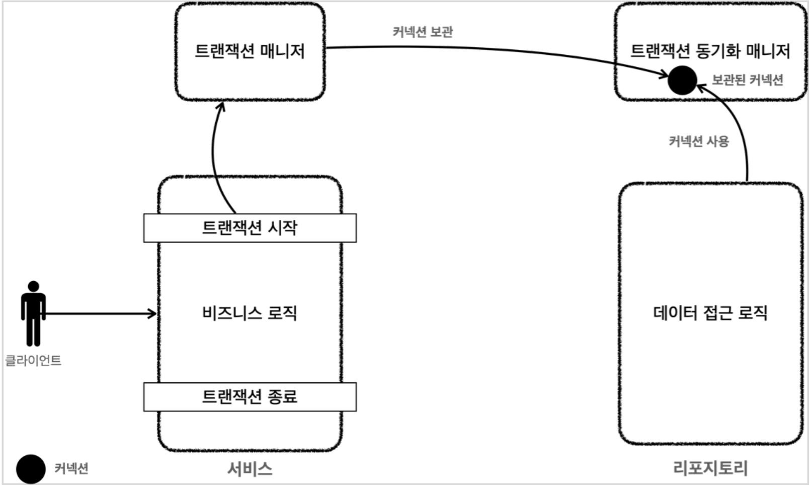 TransactionStatus status = txManager.getTransaction(new DefaultTransactionDefinition());생성된 커넥션은 트랜잭션 동기화 매니저에 보관된다. 트랜잭션 동기화 매니저는 해당 커넥션을 쓰레드로컬로 저장하여 멀티쓰레드에 안전한 트랜잭션을 보장해준다.
