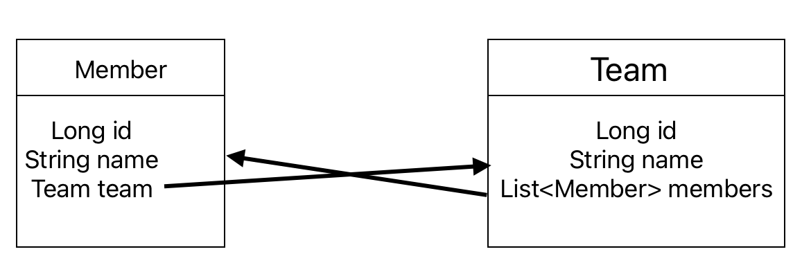 Member는 여전히 Team을 참조하고 있다. 이번에는 Team도 Member를 참조하고 있다. 이 때, 다대일 관계이므로 하나의 Team은 여러 Member를 가진다. 따라서 Member는 리스트로 참조된다.