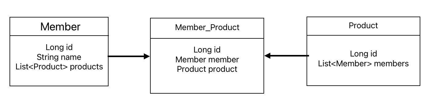 DB 엔티티 모델이 아니기 떄문에 설명을 하자면, Member와 Member_Product가 일대다, Product와 Member_Product가 일대다로 매핑되는 중간 테이블이 생긴 것이다.